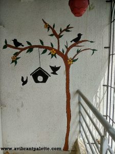 The cherry blossom tree, swing and butterflies paintings are on the living room balcony walls. The silhouette is my best work till date and I’m totally in love with it! Angel deciphered at a glance that the kids on the swing were she and her Bhaiya (as intended). The butterflies quickly became A’s favourites and he loves their vibrant colours. Angel asks things like “How do our plants eat when they don’t have a mouth?” but thankfully spared me from asking whether the butterflies will fly away. Phew! 🙂