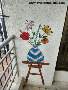 I involved Angel (since A Jr was at school) right from the paint and paint-brush buying stage and let her select the colours. I drew on the rough surface with an old sketch pen and left ample room to improvise while painting. Sacrificing her afternoon nap she sat cross-legged, hands folded, shooting a steady stream of questions at me the whole time. It was distracting but I loved her interest and concern! 🙂
